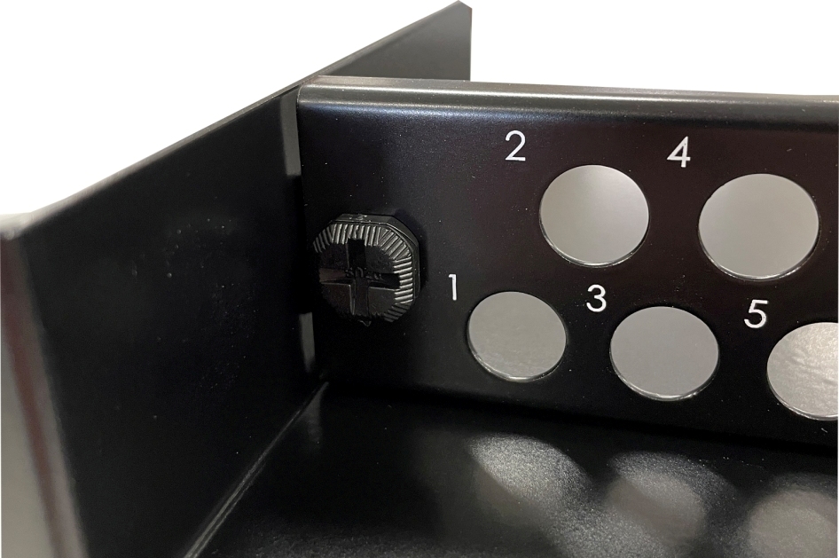 Kabelhylla med borstlist 1 HE, lackad i svart RAL9005. |
